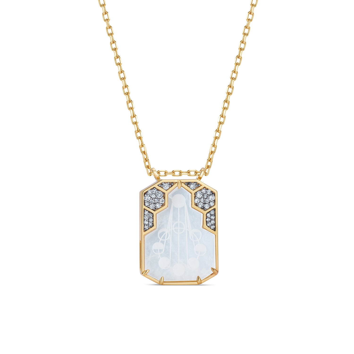 18K Yellow Gold Engraved Mother of Pearl Pendant Featuring Rock Crystal & Diamond Pave.