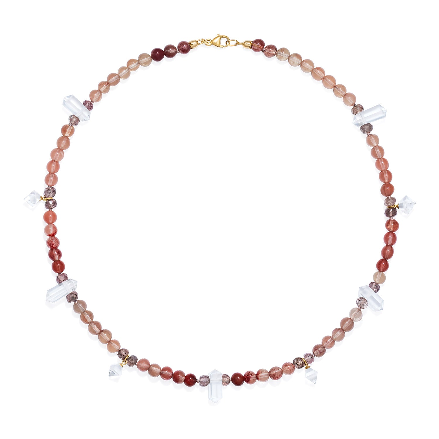 The Dusk Beads feature Custom Cut Rock Crystal and Malaya Garnet & Andesine Beads.