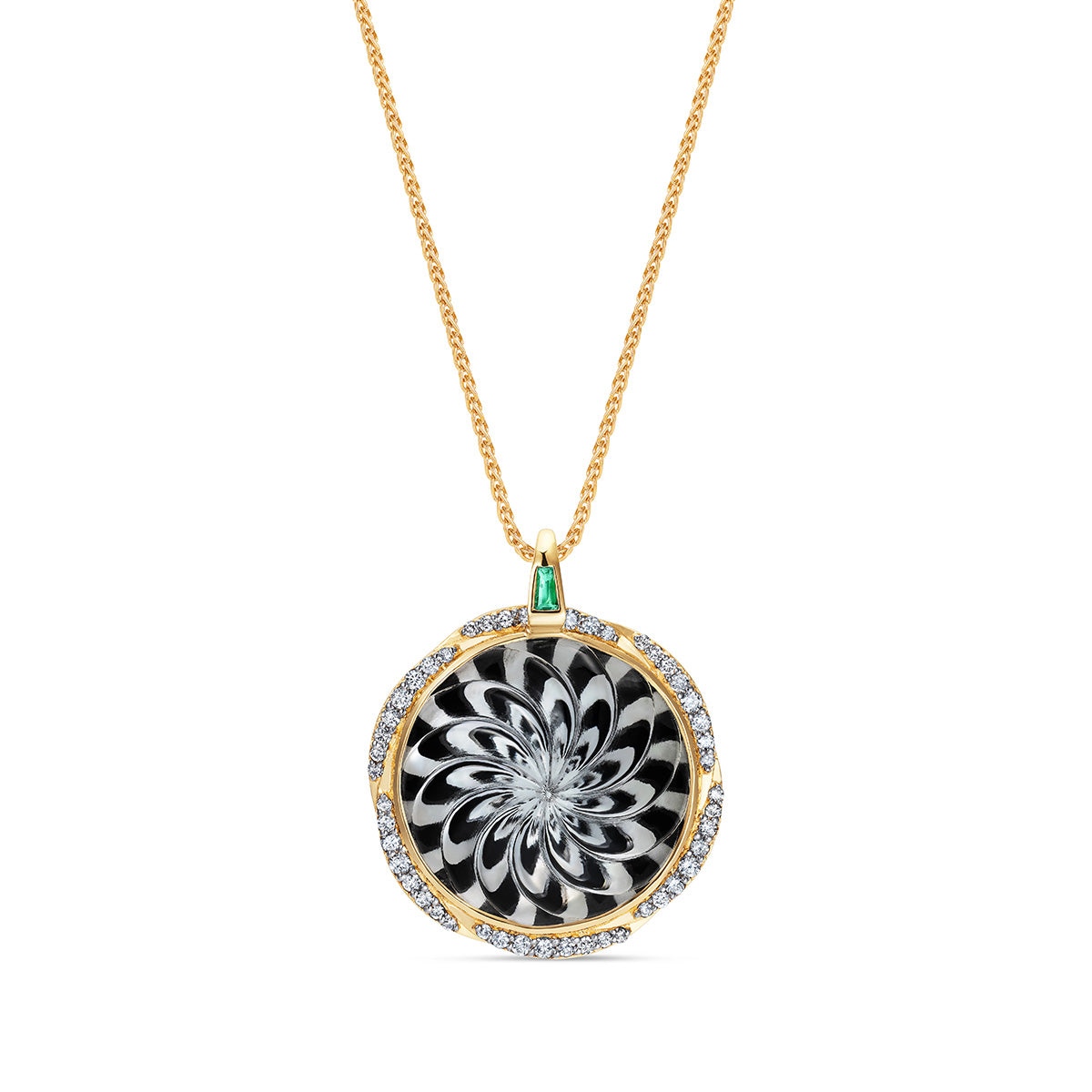 18K Yellow Gold Hand Painted Pendant Set With Carved Rock Crystal, Emerald & Diamond Pave.